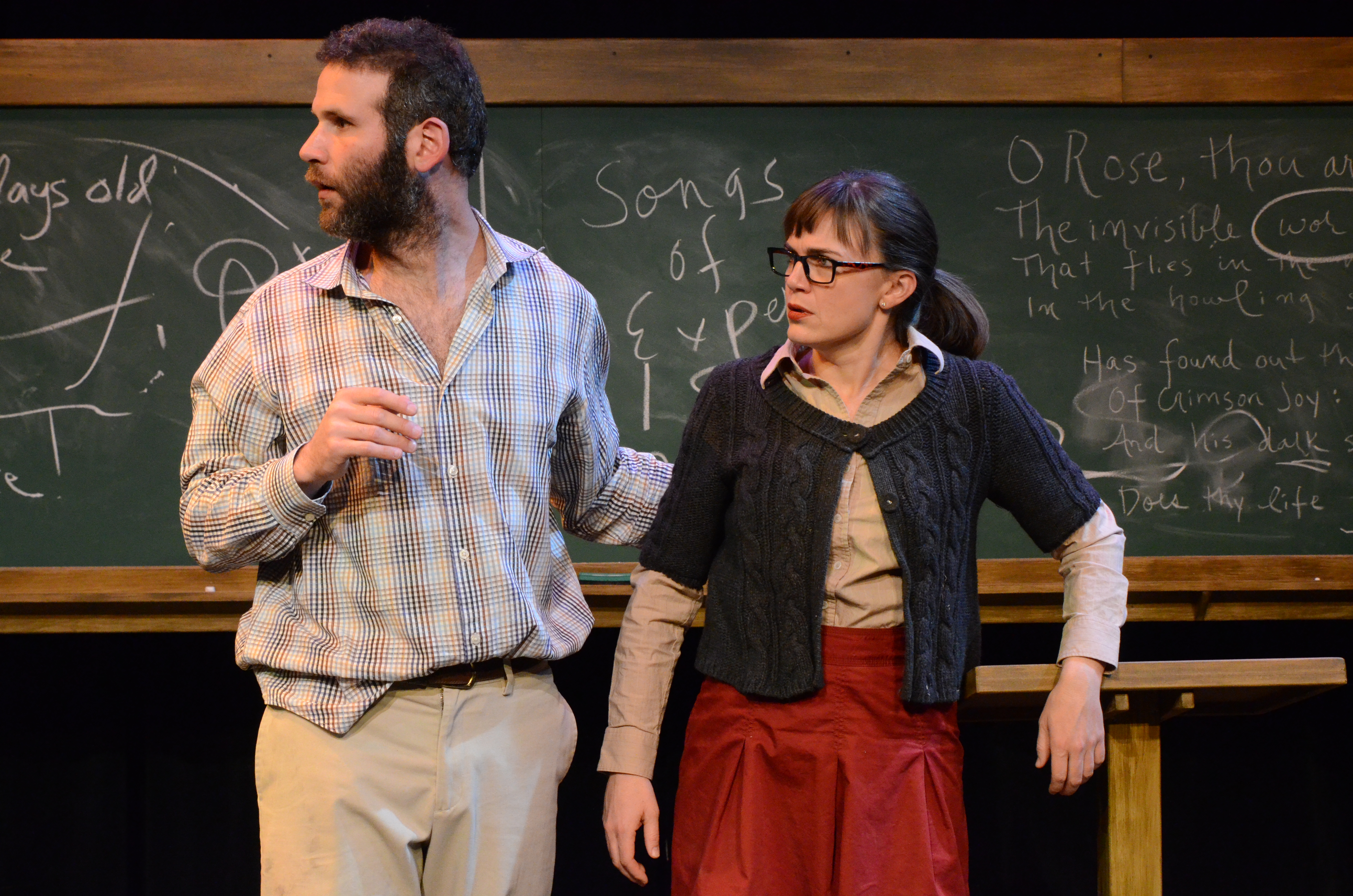 THERE IS A HAPPINESS THAT MORNING IS by Mickle Maher is a comedy in rhymed verse told via two lectures on the poetry of William Blake: one given in the morning by Bernard, a middle-aged, barely published poet of scant scholarship, on the Songs of Innocence, and the other in the afternoon by his lover, Ellen, a reputable Ph.D., on the Songs of Experience. Having engaged the evening before in a highly inappropriate display of public affection on the main lawn of their rural New England campus, the two undergraduate lecturers must now, in class, either apologize for their behavior or effectively justify it if they want to keep their jobs.